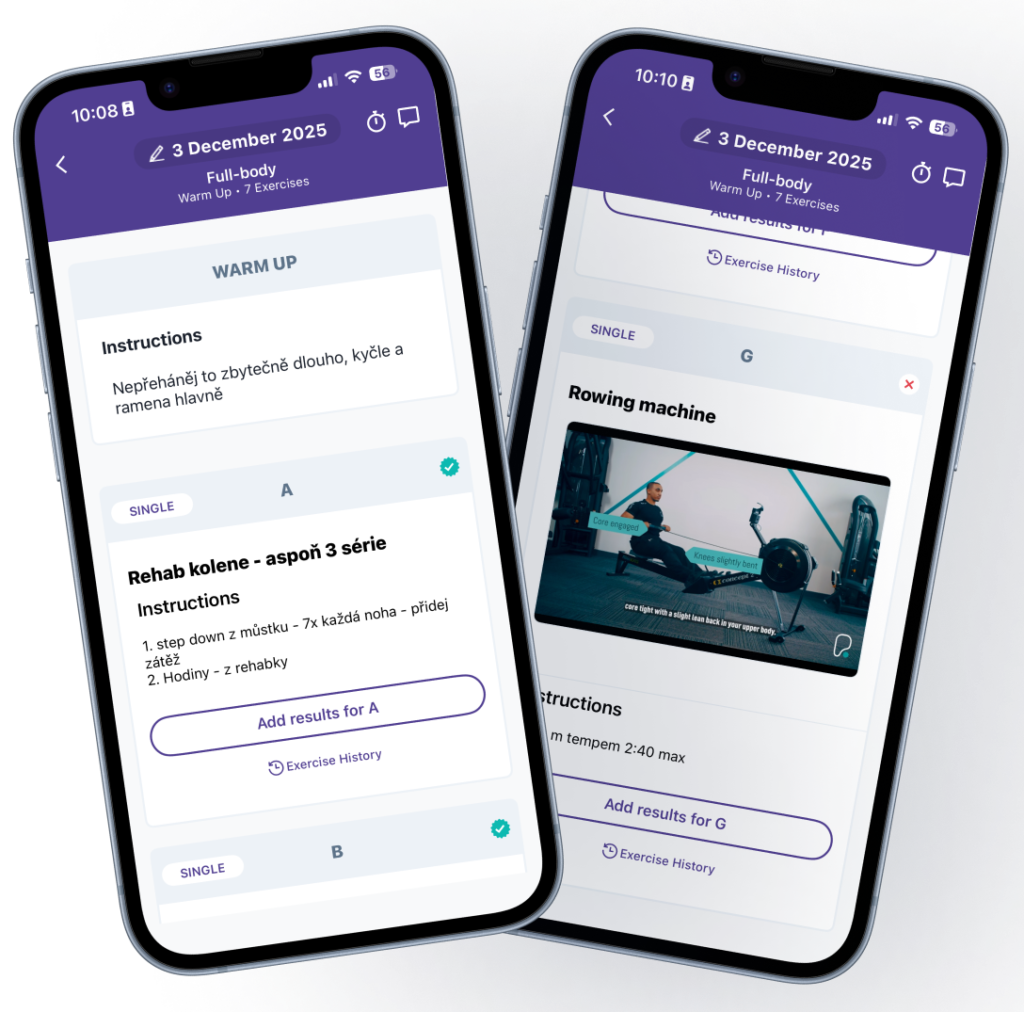 Vše máš přehledně v aplikaci: cviky, videa, postup, váhy, poznámky.